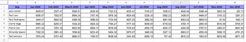 To demonstrate how to group columns in Google Sheets, we are going to use the following sample dataset. As you can see we have sales data displayed month-wise.
